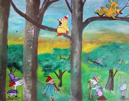 ForestIn the forest, men are drunk. A strange snout is watching the two angrily.Another man is peering at the two from behind a tree.And then you have a yellow ant who wants to get away from all this along with the bird on the swing.